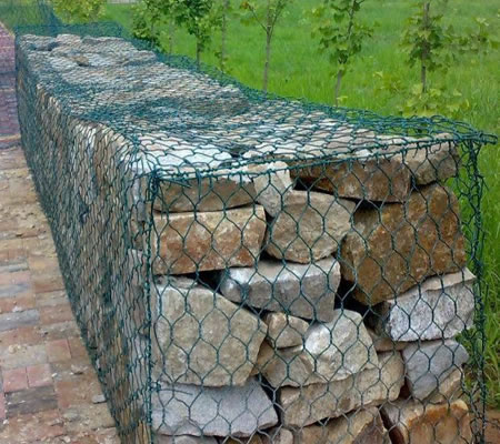 石籠網護墊分表面金屬鍍層和表面 PVC/PE涂層兩個大類。使用的金屬線徑是根據六角形的大小而不同。生產過程是經織網,剪切,鎖邊,綁扎后制成石籠和護墊。石籠和護墊以折疊狀態供貨。